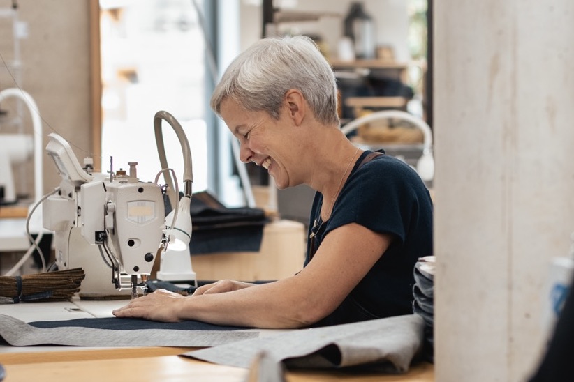 一般的な縫製作業は、流れ作業で、ひとりが同じ作業を長時間繰り返すのですが、それではスタッフの体に良くありません。